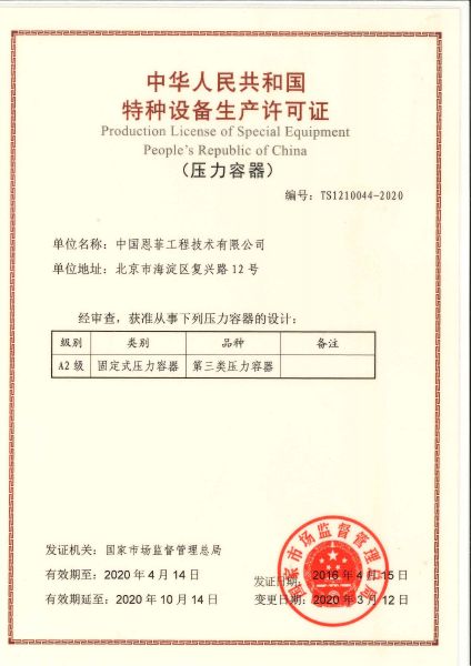 中华国民共和国特种装备出产允许证(压力容器)